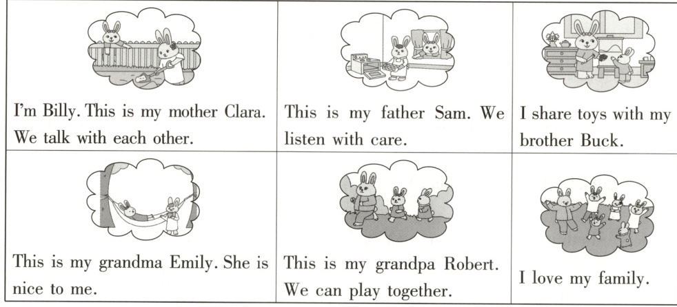 【主旨大意】本文是一则绘本故事,主要介绍了兔子Billy的一家,旨在引导我们要爱自己的家人,家人之间要懂得分享和倾听。