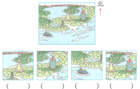3. (空间观念)如图所示为军军沿着小河游览的风景图,他自西向东连续拍摄