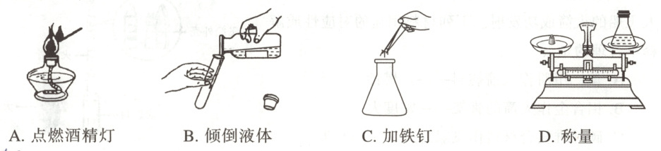 14.A【详解】A.使用酒精灯时要注意“两查、两禁、一不可”,点燃酒精灯要用火柴或打火机点燃;B.倾倒液体药品时,瓶塞要倒放,标签要对准手心,试管倾斜,试剂瓶口紧挨试管口;C.向锥形瓶中加入铁钉,应先将锥形瓶横放,将铁钉放在锥形瓶口,然后将锥形瓶慢慢直立起来;D.使用托盘天平时,应遵循“左物右码”的原则。