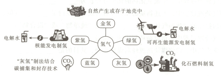 加快能源转型升级,发展新质生产力。氢气是最理想的清洁能源,依据不同制取方式,可分为“绿氢”“灰氢”“蓝氢”“紫氢”和“金氢”等。如图带你认识“多彩”的氢。
