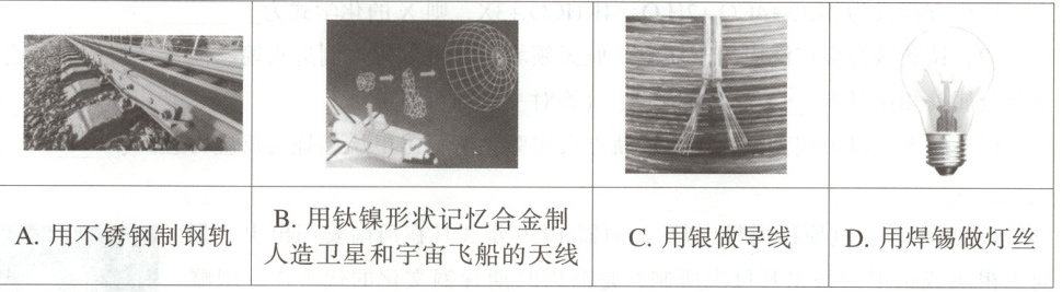 4.B【详解】A.不锈钢的强度、耐磨度达不到钢轨的要求,不能用来制钢轨;D.锡的熔点低,不能用锡做灯丝,通常用钨丝做灯丝。