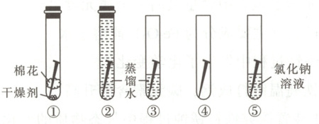 2. 将五枚洁净无锈的铁钉分别放入 5 支试管进行以下实验(如图),一周后观察现象。