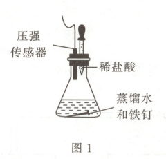 6. 兴趣小组设计图 1 装置探究铁钉锈蚀过程中气态物质的变化,恒温下,向锥形瓶中加入少量稀盐酸,同时测量锥形瓶内气体压强随时间的变化,直至反应完全,变化曲线如图 2,下列有关说法错误的是(