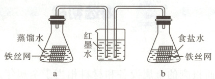 4. 将两张相同的铁丝网置于两个相同大小的锥形瓶中,分别倒入等体积的蒸馏水和食盐水,立即旋紧橡皮塞,将导管伸入滴有红墨水的水中。一段时间后,观察到烧杯中的导管内液面上升,且右侧导管内液面上升幅度较大,锥形瓶 b 中的铁丝网比 a 中的铁丝网锈蚀更严重。下列相关说法不正确的是(