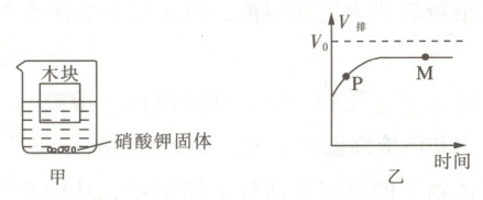 2. 一块体积为$V_0$的木块漂浮于装有硝酸钾($ KNO_3$)溶液(有部分硝酸钾固体未溶解)的小烧杯中,如图甲所示。当温度改变时(不考虑由此引起的木块和溶液体积的变化),木块排开水的体积$V_{排}$随时间发生的变化如图乙所示。下列有关说法正确的是(