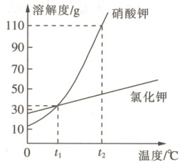 D.$t_2\ ° C$时,硝酸钾饱和溶液中溶质与溶剂的质量比为11:21