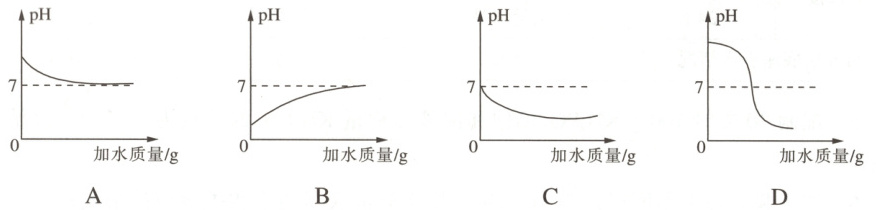 2. 将一定溶质质量分数的醋酸加水稀释,其$pH$随加水质量的变化图示正确的是 ( )