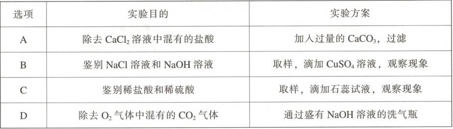 4.C【详解】A.盐酸能与碳酸钙反应生成氯化钙、水和二氧化碳,再过滤除去过量的碳酸钙(难溶于水),能除杂质且没有引入新的杂质,符合除杂原则,该选项实验方案设计正确;B.硫酸铜能与氢氧化钠反应生成氢氧化铜沉淀,则取样,滴加硫酸铜溶液,能产生蓝色沉淀的是氢氧化钠溶液,无明显现象的是氯化钠溶液,可以鉴别,该选项实验方案设计正确;C.稀盐酸和稀硫酸都显酸性,都能使紫色石蕊溶液变红,故鉴别稀盐酸和稀硫酸不能使用紫色石蕊溶液,该选项实验方案设计不正确;D.氢氧化钠能与二氧化碳反应生成碳酸钠和水,能用于吸收二氧化碳,且氢氧化钠不与氧气反应,故除去$O_2$气体中混有的$CO_2$气体,可以通过盛有NaOH溶液的洗气瓶,该选项实验方案设计正确。