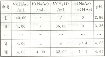 (3)①实验Ⅶ的溶液中n(NaAc)∶n(HAc)=3∶4,V(HAc)=4.00mL,因此V(NaAc)=3.00mL,即a=3.00,由实验Ⅰ可知,溶液最终的体积为40.00mL,因此V(H₂O)=40.00mL−4.00mL−3.00mL=33.00mL,即b=33.00。