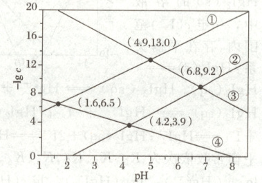 12. (2023·辽宁卷,3分)某废水处理过程中始终保持${H_{2}S}$饱和,即$c{(H_{2}S)}=0.1\ {mol· L^{-1}}$,通过调节$pH$使${Ni^{2+}}$和${Cd^{2+}}$形成硫化物而分离,体系中$pH$与$- \lg \nolimits c$关系如下图所示,$c$为${HS^{-}}$、${S^{2-}}$、${Ni^{2+}}$和${Cd^{2+}}$的浓度,单位为${mol· L^{-1}}$。已知$K_{ sp}(NiS) > K_{ sp}(CdS)$,下列说法正确的是(