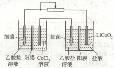 14. (双选)(2022·山东卷)设计如图装置回收金属钴。保持细菌所在环境$pH$稳定,借助其降解乙酸盐生成${CO_{2}}$,将废旧锂离子电池的正极材料${LiCoO_{2}(s)}$转化为${Co^{2+}}$,工作时保持厌氧环境,并定时将乙室溶液转移至甲室。已知电极材料均为石墨材质,右侧装置为原电池。下列说法正确的是(