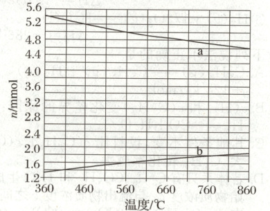 (2)(ⅰ)由$\Delta H_1 < 0$,升高温度,该反应的平衡逆向移动,$n(CH_4)$增大,$n(CH_3Br)$减小,故图中$CH_3Br$的曲线是a。 (ⅱ)根据题图可知,560℃时,平衡时$n(CH_4) = 1.6 mmol$,$n(CH_3Br) = 5.0 mmol$,则$CH_4$的转化率$\alpha = \frac{8 mmol - 1.6 mmol}{8 mmol} × 100\% = 80\%$,$CH_4$的转化量为6.4 mmol,故进一步溴化的$CH_3Br$的物质的量为$(6.4 - 5.0) mmol = 1.4 mmol$,则$CH_3Br$进一步溴化生成的$HBr$的量为1.4 mmol,故$n(HBr) = 6.4 mmol + 1.4 mmol = 7.8 mmol$。 (ⅲ)假设$CH_4$与$Br_2$反应生成$CH_3Br$平衡后$CH_3Br$再进一步溴化,根据题图中的数据,并结合(ⅱ)的分析,列三段式: