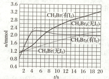 (3)(ⅰ)根据图中关于$CH_3Br$的数据可得,$v(有I_2) = \frac{(3.2 - 2.6) mmol}{(19 - 11) s} = 0.075 mmol · s^{-1}$,$v(无I_2) = \frac{(2.2 - 1.8) mmol}{(19 - 11) s} = 0.05 mmol · s^{-1}$,则$\frac{v(有I_2)}{v(无I_2)} = \frac{0.075 mmol · s^{-1}}{0.05 mmol · s^{-1}} = 1.5$。 (ⅱ)由题图知,有$I_2$时,$CH_3Br$的量明显提高,$CH_2Br_2$的量降低,且约7.5 s后,体系中$CH_3Br$的量高于$CH_2Br_2$的量,故$I_2$提高了$CH_3Br$的选择性。 (ⅲ)$I_2$产生的·I可将反应后的含碳物质$CH_2Br_2$经过反应②、③转化为$CH_3Br$;而反应过程中生成的·Br可继续与$CH_4$经过反应④、⑤生成$CH_3Br$,提高了生成的$CH_3Br$的量,减少了$CH_2Br_2$的量,从而提高$CH_3Br$选择性。