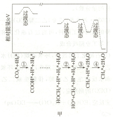 (3)最慢的基元反应为反应历程中活化能最大的步骤,由图甲可知,反应④的活化能最大,所以该步骤最慢;生成水的反应为③,其反应方程式为HO+CH+H2+H2OCH +2HO(或HO+CH+H+H+HO−CH+H+2HO、HO+CH+HCH+HO)。