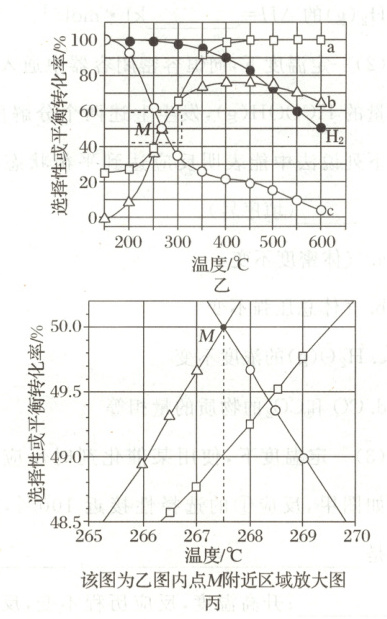 CH4与CO2的选择性相加为100%,结合点M附近区城放大图可知曲线b、c分别表示CH4或CO2的选择性;反应II放热,随温度升高平衡逆向移动,即CH4的选择性降低,反应I吸热,随温度升高平衡正向移动,CO2的选择性升高,所以曲线c 表示CH4的选择性。②曲线a表示MgCO的平衡转化率,100kPa下,H2和MgCO3的初始物质的量为1mol,由图丙可知点M温度下,MgCO的平衡转化率为49%,即△n(MgCO)