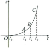 7. $\overline{v}_3>\overline{v}_2>\overline{v}_1$ 【解析】如图,连接OA,AB,BC.根据题意,汽车在时间段$[t_0,t_1],[t_1,t_2],[t_2,t_3]$上的平均速度分别为$\overline{v}_1,\overline{v}_2,\overline{v}_3$,它们分别为直线OA,AB,BC的斜率.由图得$k_{BC}>k_{AB}>k_{OA}$,故$\overline{v}_3>\overline{v}_2>\overline{v}_1$.