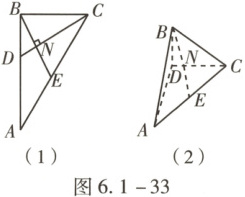 例23 如图6.1-33(1),在△ABC中,$\angle ACB=60°$,CD为$\angle ACB$的平分线,AC=4,BC=2,过点B作BN⊥CD于点N,延长后交CA于点E,把图形沿CD折起,使$\angle BNE=120°$,如图6.1-33(2)所示,求折起后所得线段AB的长度.