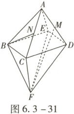 6. (新情境 柏拉图立体(2025 · 北京市第二十中学月考)正多面体也称柏拉图立体,被誉为最有规律的立体结构,是所有面都只由一种正多边形构成的多面体(各面都是全等的正多边形). 数学家已经证明世界上只存在五种柏拉图立体,即正四面体、正六面体、正八面体、正十二面体、正二十面体. 如图6.3-31,已知一个正八面体 $ABCDEF$ 的棱长为2,$M$,$N$ 分别为棱 $AD$,$AC$ 的中点,则直线 $BN$ 和 $FM$ 夹角的余弦值为 (