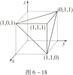 解析▶在空间直角坐标系中作出四点,如图6-18,该四面体体积为$\frac{1}{3}×\frac{1}{2}×1×1×1=\frac{1}{6}$.