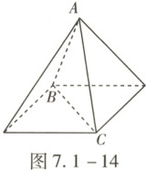 解析 ▶ 由题意得△ABC为正三角形. 根据正四棱锥的定义知,正四棱锥的底面是正方形,顶点在底面的射影是正方形的中心,故所给正△ABC的任意一条边可以为底面正方形的一条边或对角线,将△ABC的一条边作为底面正方形的一条边,若将BC作为底面正方形的一条边,可在△ABC的左侧取不同的两点E,F,使得这两点与A,B,C构成正四棱锥A-BCEF,在△ABC的右侧取不同的两点E′,F′,使得这两点与A,B,C构成正四棱锥A-BCE′F′,如图7.1-13,同样,AB,AC也可作为底面正方形的一条边,所以方案数为3×2=6;将△ABC的一条边作为底面正方形的对角线时,若将BC作为底面正方形的对角线,可构造一个正四棱锥,如图7.1-14,同样AB,AC也可作为底面正方形的对角线,所以方案数为3. 故不同的取法有6+3=9(种).