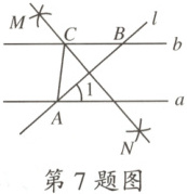 7.如图,已知a//b,直线l与直线a,b分别交于点A,B,分别以点A,B为圆心,大于$\frac{1}{2}AB$的长为半径画弧,两弧相交于点M,N,作直线MN,交直线b于点C,连接AC,若∠1 = 38°,则∠ACB的度数是