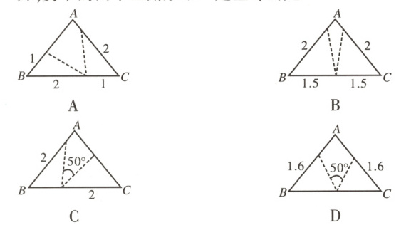 6.(郑州期末)在△ABC中,∠B=∠C=50°,将△ABC沿图中虚线剪开,剪下的两个三角形不一定全等的是 (
