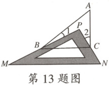 13.如图,在△ABC 中,有一块直角三角板 PMN 放置在△ABC 上(点 P 在△ABC 内),使三角板 PMN 的两条直角边 PM,PN 恰好分别经过点 B 和点 C. 若∠A = 52°,则∠1 + ∠2 =