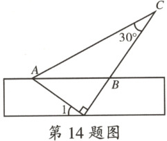 14.将一个三角尺和一把直尺按如图所示的方式摆放.若△ABC 是等腰三角形,则$∠1$的度数是