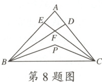8.如图,$P$为$\triangle ABC$内一点,$\angle BAC=70^{\circ}$,$\angle BPC=120^{\circ}$,$BD$是$\angle ABP$的平分线,$CE$是$\angle ACP$的平分线,$BD$与$CE$交于点$F$,则$\angle BFC=$