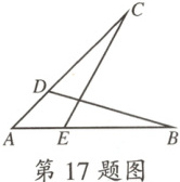 17.为了庆祝神舟二十号的成功发射,学校组织了一次小制作展示活动,小明计划制作一个如图所示的简易模型,已知该模型满足$\triangle ABD\cong\triangle ACE$,点$B$和点$C$是对应顶点,若$AB=8$cm,$AD=3$cm,则$DC=$