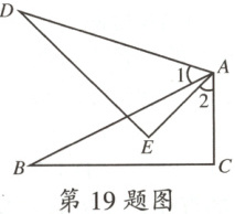 19.如图,$\angle1=\angle2$,$AE=AC$,要使$\triangle ADE\cong\triangle ABC$,则可添加的一个条件是