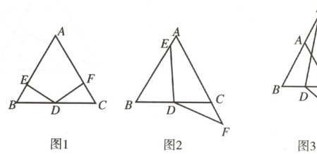 15.在等边三角形$ABC$中,点$D$是$BC$的中点,$\angle EDF = 120^{\circ}$,$\angle EDF$的两边分别交直线$AB$,$AC$于点$E$,$F$.