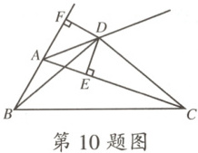 10.如图,点$D$是$\triangle BAC$的外角平分线上一点,过点$D$作$DE\perp AC$于点$E$,作$DF\perp AB$交$BA$的延长线于点$F$,连接$BD$,$CD$.若$BD=CD$,有下列结论:①$DE=DF$;②$\triangle CDE\cong\triangle BDF$;③$CE=AB+AE$;④$\angle BAC=\angle BDC$.其中正确的结论有 (