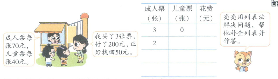 答:妈妈买了( )张成人票,( )张儿童票。
