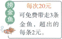 解析 玩一次需要20元,可以免费带走3条金鱼。乐乐玩了一次,带走10条金鱼,超出的$10 - 3 = 7$(条)要按照每条2元的价格付费,也就是$7 × 2 = 14$(元)。所以一共要付$20 + 14 = 34$(元)。