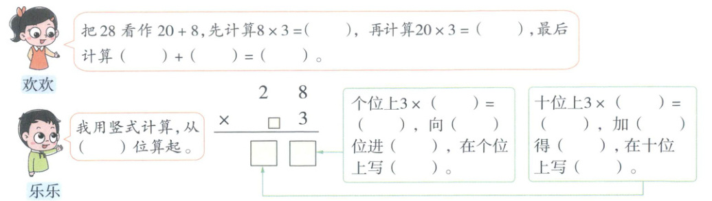 1 在计算 $28×3$ 时,两位同学采用了不同的方法,请你帮他们补充完整。