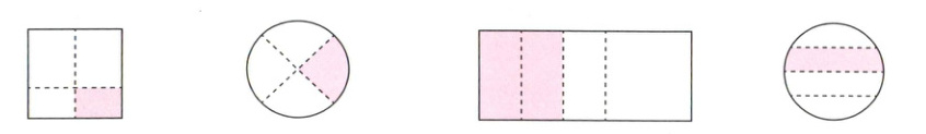 7 下面哪些图中的涂色部分可以用分数$\dfrac{1}{4}$表示?在括号里画“√”。