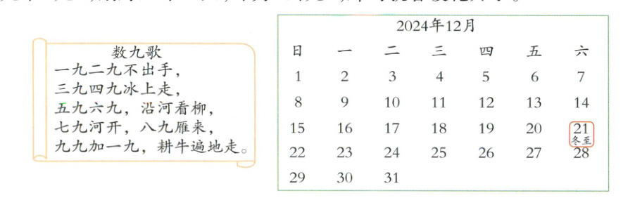 (2)妈妈打算带明明去室外滑冰,根据“数九歌”的说法,再看看月历,他们可以在哪一天去?