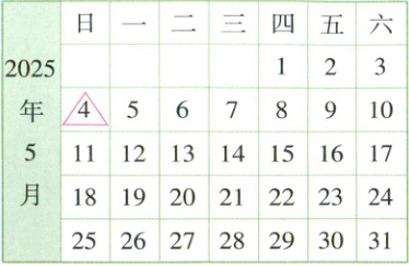1 2025 年是中国共产主义青年团成立 103 周年。如图,月历上用△圈出了“五四青年节”的日期。
