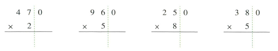 1 $\begin{array}{r} 4\ 7\ 0\\ ×\ \ \ \ 2\ \ \ \\ \hline 9\ 4\ 0\end{array}$ $\begin{array}{r} 9\ 6\ 0\\ ×\ \ \ \ 5\ \ \ \\ \hline 4\ 8\ 0\ 0\end{array}$