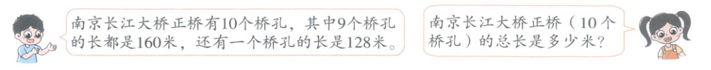 南京长江大桥正桥有10个桥孔,其中9个桥孔的长都是160米,还有一个桥孔的长是128米。