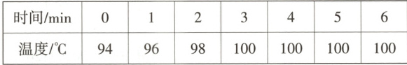 $^{\circ}C$。(2)当水温升高到$94^{\circ}C$时,每隔1 min记录一次温度填入上表,同时观察水中发生的现象。当烧杯内的水中形成大量气泡不断上升、变大,到水面破裂开来,里面的水蒸气散发到空气中时,表明水