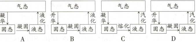6. 水是人类环境的重要组成部分。水通过吸热、放热在固态、液态、气态三种状态间相互转化,如图所示,关于物质的三态之间转化过程所对应的物态变化名称,标注都正确的是 (