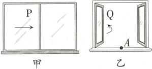 (选填“随”或“不随”)窗户P平移;若将图乙中窗户Q向外转动$120^{\circ }$打开,则窗台上的A点的像将随