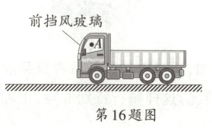 16. 安全意识情境大货车视野盲区在一次交通安全教育活动中,交警叔叔强调,大货车存在视野盲区,同学们应注意避让。如图,A点为驾驶员眼睛所在的位置,请利用光路作图标注出驾驶员观察前方路况时的盲区范围(前挡风玻璃的厚度忽略不计)。