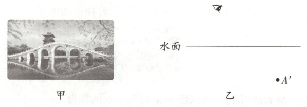 18. 〔开封模拟〕图甲是小美同学游玩清明上河园时拍的一张风景照,图乙中$A^{\prime }$点是拱桥顶部在水中的像,请画出拱桥顶部经过水面反射进入人眼的光路图。