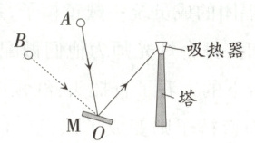 15. 〔北京市〕(双选)如图所示,定日镜M将太阳光反射到高塔顶端的吸热器上。当太阳从A位置移动到B位置,反射的阳光依旧能照射在塔顶。若两个位置的入射光形成的夹角$\angle BOA$为$40^{\circ }$,则下列说法正确的有