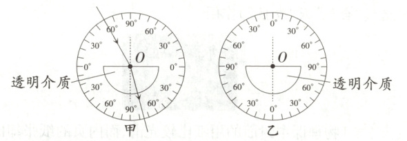 (1)让激光束从空气中以不同角度斜射入不同透明介质中,记录下入射角和折射角。图甲是某次实验的情形,此次实验的入射角大小是
