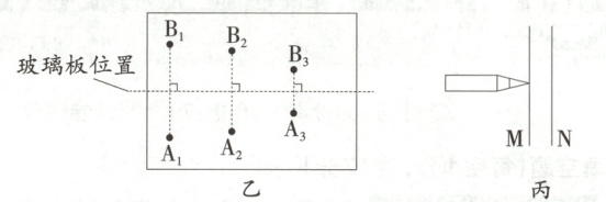 。(6)如图丙所示,小明发现家中穿衣镜是由一定厚度的玻璃制成的,他想确定穿衣镜成像的反射面,于是将笔尖紧贴镜子前表面M,发现笔尖的像与笔尖之间有一段距离,说明