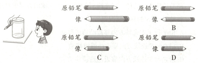 14. 设题新角度 模型建构 (双选) 找一个圆柱形的玻璃瓶,向里面装水。把一支铅笔水平地放在玻璃瓶的一侧,透过玻璃瓶,可以看到那支笔,如图所示。如果把铅笔沿水平方向由靠近玻璃瓶的位置向远处慢慢地移动,则透过玻璃瓶看到的像不可能是 (